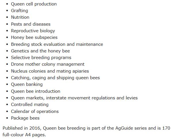This NSW DPI Queen Bee Breeding Book covers all the requirements to producing your own Queens.Topics cover cell raising, grafting, nutrition, pests and diseases, reproductive biology, genetics, mating apiaries, queen banking, controlled mating, packaging.