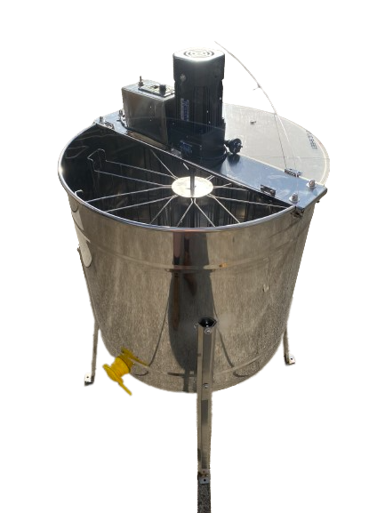This 8 frame stainless steel motorized variable speed Radial extractor saves your arms. It is on legs high enough to place a 10 Ltr / 15 Kg bucket under the outlet.