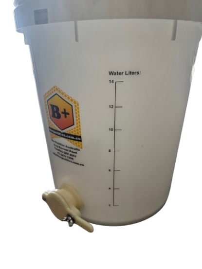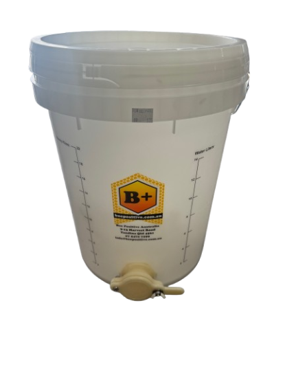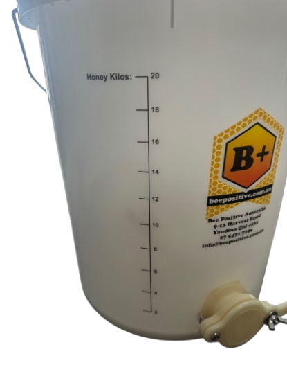 Our own plastic buckets that allow you to see the volume of honey against the scale.