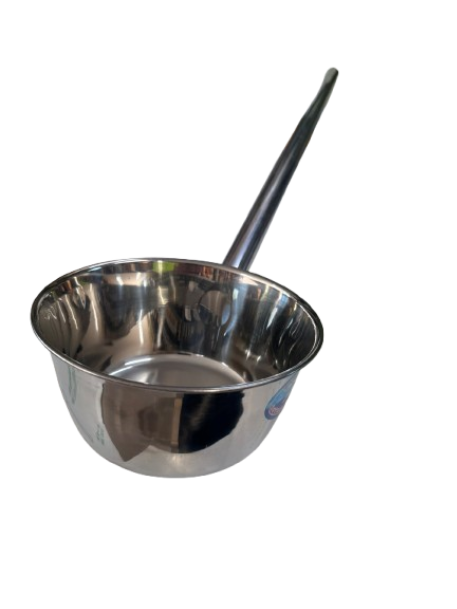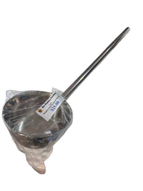 A strong, food-grade stainless steel scoop designed for handling honey, sugar, wax, and other beekeeping materials.
