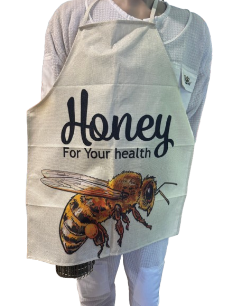 A fun and practical apron featuring a playful bee design and the text “Honey for your Healty.”